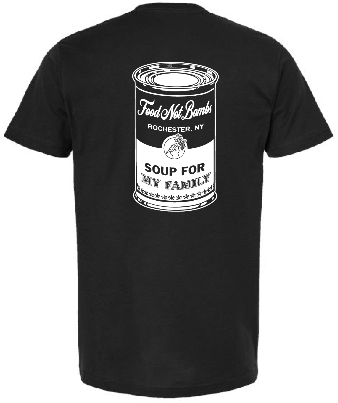 Printed with the Food Not Bombs logo on the left chest location, and Andy’s can on the back, these shirts are sharp and bold.